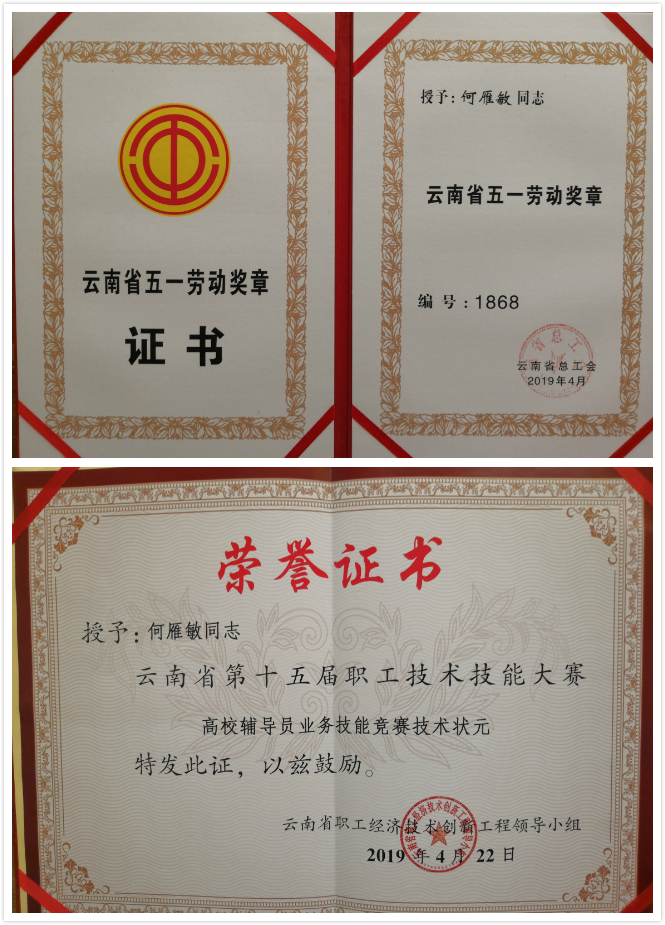 自2018年开始,在省高校工委、省教育厅举办的高校辅导员素质能力决赛总成绩第一名的选手,将由省委高校工委和省总工会授予“云南省高校辅导员素质能力冠军”称号并发证书,符合条件的优先推荐申报“云南省五一劳动奖章”称号。何雁敏老师在第八届云南省高校辅导员素质能力决赛总成绩排名第一,通过推荐评审,成为云南省获得该奖项的第一位辅导员。