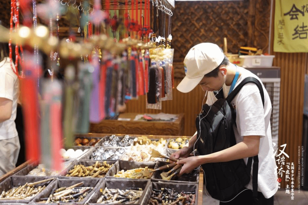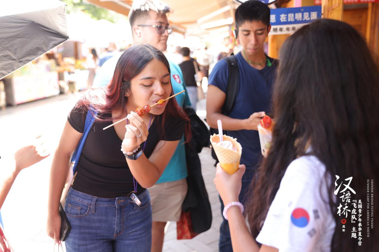 下午,营员们来到了官渡古镇。大家沿街走进各大商铺,欣赏民族特色工艺品,品尝特色美食。璞玉制成的手镯、吊坠,印有民族图腾的头饰、服饰……古香古色的各类新奇商品让营员们应接不暇。Torrey Ge最喜欢的就是中国珠宝,“这里的饰品跟美国的完全不一样,很多我都没有见过,很有特色,真是一次奇妙的体验!”奶茶、咖啡、烧烤、冰糖葫芦、糖画、官渡粑粑……各种口感在舌尖碰撞,带来了味蕾上的享受。Brian chan是第一次吃中国烧烤,“辣!我感觉像火在我舌尖上燃烧,但是非常好吃,非常过瘾!”