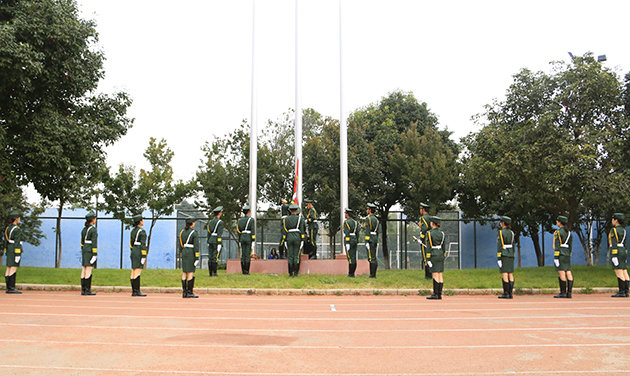 随着铿锵有力、整齐划一的脚步声,英姿飒爽的国旗护卫队昂首挺胸护卫着国旗走来,在全体师生的注目下,迎着朝阳,走向升旗台。在雄壮的国歌声中,全体师生神情庄重,凝视着鲜艳的五星红旗冉冉升起,嘹亮的国歌声响彻校园。
