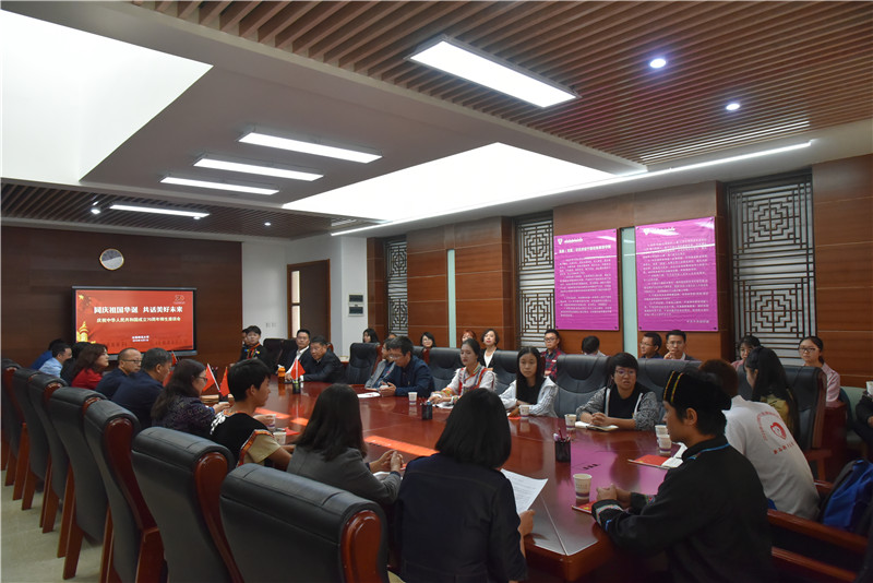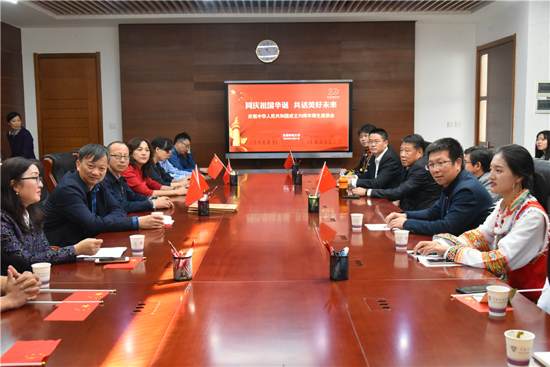 10月1日上午11时,以“同庆祖国华诞,共话美好未来”为主题的庆祝中华人民共和国成立70周年师生座谈会在必赢官网呈贡主校区行政楼会议室举行。会议由校党委副书记李宏主持。相关职能部门和学院负责人、优秀一线教师代表、优秀辅导员代表、民主党派代表和校团学干部代表、习近平新时代中国特色社会主义思想学生宣讲团等师生代表参加座谈会。