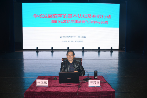 10月20日上午,云南省语文特级教师、云南省五一劳动奖章获得者、云南省首届“教育功勋”奖获得者、云南民族大学附属中学李兴富校长在昆明理工大学红土会堂为云南省“万名校长培训计划”第三期的学员作了题为《学校发展变革的基本认知及有效行动——新时代莲花品质教育的探索与实践》讲座。讲座由云南教育干部培训中心主任、万名校长培训计划项目办主任林卫东主持。