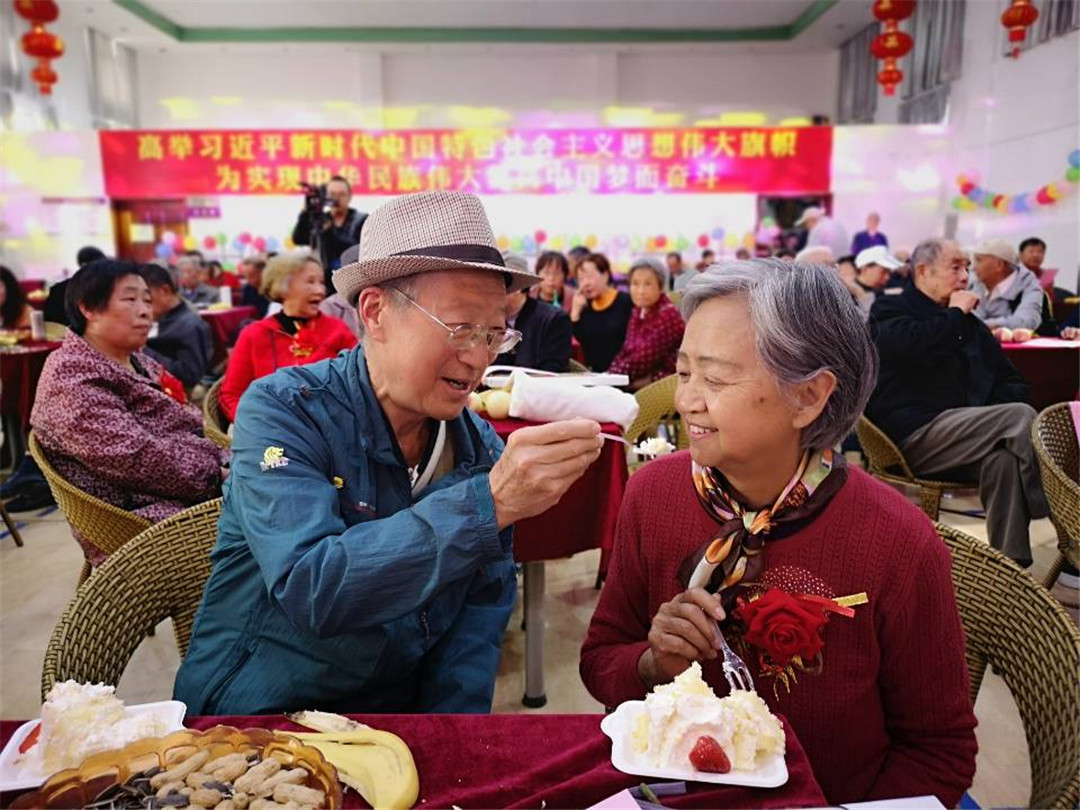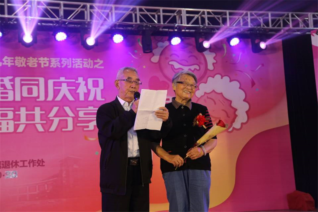 祝寿庆金婚的环节,22对度过半世纪婚姻生活的幸福老人在大家的掌声中相互搀扶走上舞台,每位丈夫含情为相伴五十载的妻子献上红玫瑰,并进行表白,与大家分享五十年相濡以沫的爱情故事。钻石婚夫妇——胡植夫老师与大家共同分享了他们从青梅竹马、两小无猜到结发为夫妻60年的幸福婚姻。