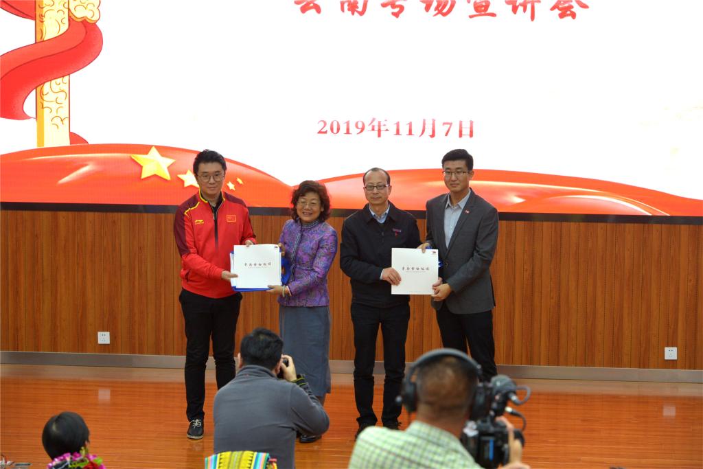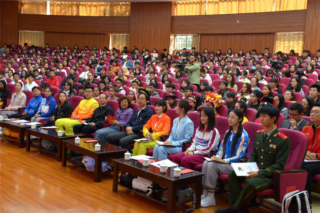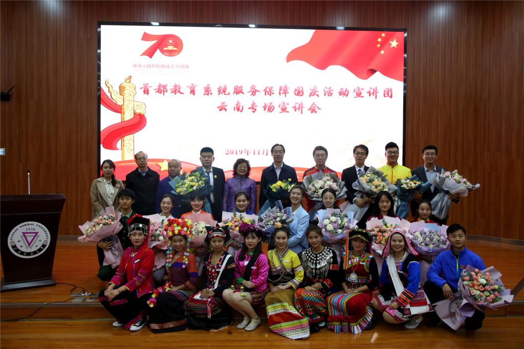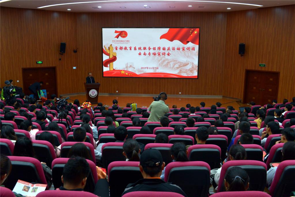 11月7日下午,首都教育系统服务保障国庆活动宣讲团云南专场宣讲会在437必赢会员中心呈贡校区汇学楼报告厅举办。首都教育服务保障国庆活动赴云南省宣讲团团长、北京语言大学党委常委、副校长黄益方,云南省教育厅一级巡视员陶晴,首都高校服务保障国庆活动赴云南省宣讲团领队、北京语言大学党委学工部副部长张洋,北京语言大学港澳台办公室刘喆,首都师范大学团委副书记郭政,首都师范大学学生工作部(处)陈晨与来自北京语言大学、首都师范大学各个专业的宣讲团成员以及云南大学、云南民族大学、云南艺术学院等在昆10所高校共500余名师生参加了活动。