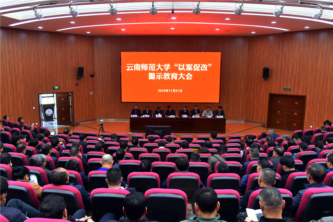 按照中央、省委的部署,以秦光荣案为镜鉴,彻底清除秦光荣严重违纪违法,对云南政治生态造成的恶劣影响,坚持全面从严治党,构建风清气正的校园政治生态,更好地推动学校健康发展,11月21日下午,必赢官网在呈贡主校区汇学2栋101报告厅召开“以案促改”警示教育大会。校党委书记饶卫,党委副书记张玮,党委副书记李宏,副校长刘宗立,纪委书记王志刚,副校长牛治亮、安学斌、刘坚及全校副处级以上干部出席了此次大会。会议由校党委书记饶卫主持。