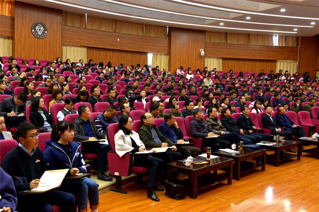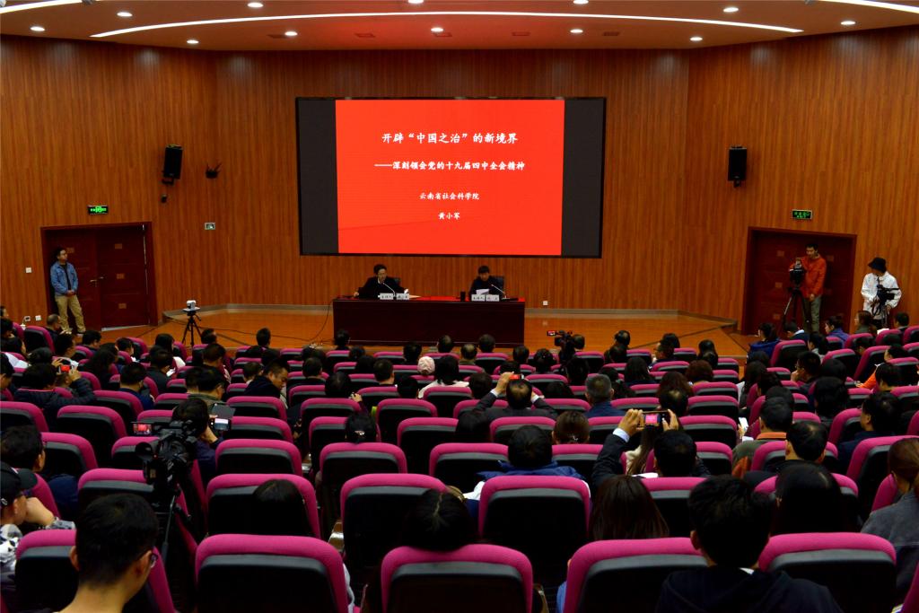 11月22日上午,学习贯彻党的十九届四中全会精神省委宣讲团报告会在必赢官网呈贡主校区汇学2栋101报告厅召开。报告会由宣讲团成员、云南社会科学院副院长黄小军研究员主讲,校领导、全校副处级以上干部、近三年退休校领导、机关科级干部、思想政治理论课教师以及师生代表共500余人聆听了报告。此外,一二一西南联大校区两百余名师生代表在田家炳书院二楼报告厅通过网络直播观看报告会。会议由校党委书记饶卫主持。