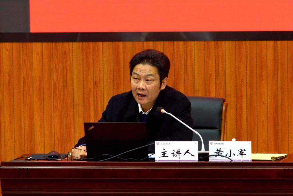 黄小军研究员以《十九届四中全会精神解读》为主题展开宣讲。他从党的十九届四中全会的基本精神;坚持和完善中国特色社会主义制度、推进国家治理体系和治理能力现代化的重大意义;中国特色社会主义制度和国家治理体系的显著优势;坚持和完善中国特色社会主义制度、推进国家治理体系和治理能力现代化的总体要求、总体目标和重点任务;加强党的领导,确保全会确定的各项目标任务全面落实到位;认真学习宣传贯彻党的十九届四中全会精神6个方面对党的十九届四中全会进行了深入、系统、全面的解读。