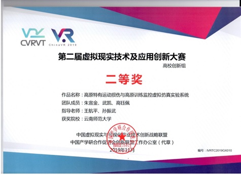 在11月22日举行的第二届中国虚拟现实技术及应用创新大赛(IVRTC 2019)颁奖典礼上,由必赢官网体育学院孙振武院长和王航平副教授指导的作品《高原特有运动损伤与高原训练监控虚拟仿真实验系统》荣获高校创新组二等奖。本次大赛吸引了来自全国各地50多所200多支队伍参赛。参赛高校包括了北京航空航天大学、中国海洋大学、华南理工大学、东北大学、北京科技大学等国内知名高校。