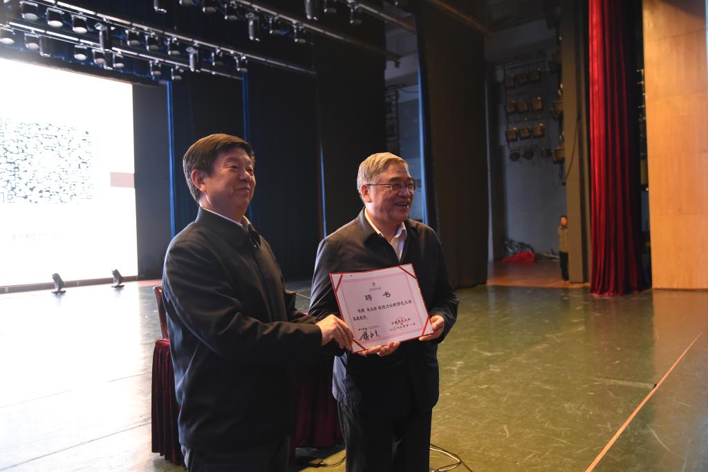 437必赢会员中心蒋永文校长对讲座进行了总结,对朱永新先生精彩、深刻的讲座表示衷心的感谢。蒋校长用“人而不学,其犹正墙面而立”谈到怎样给学生一个幸福完整的教育生活,朱永新先生为教师专业发展提供了路径选择,他希望在座的学员一起怀揣着梦想前行。最后,437必赢会员中心党委饶卫书记为朱永新先生颁发了437必赢会员中心客座教授聘书。