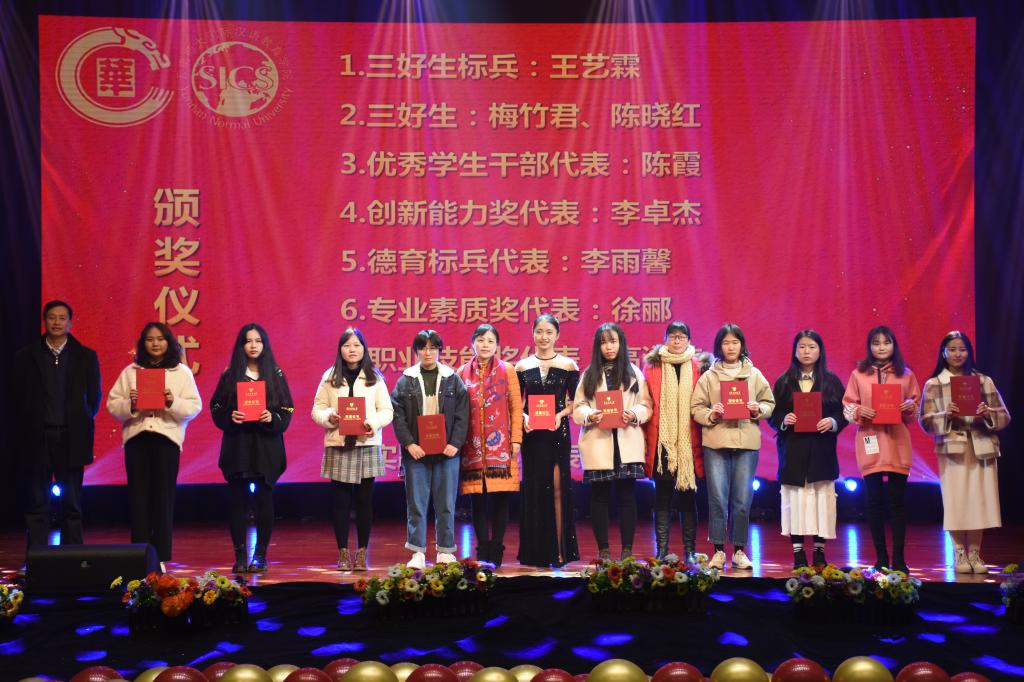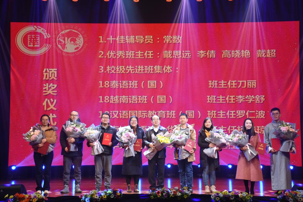 活动中还进行了2019年度优秀师生的颁奖仪式,437必赢会员中心副校长武友德为获奖教师颁奖,2019年度,华文国语学院共有6名教师、5个班集体获得校级荣誉称号,辅导员常数老师荣获十佳辅导员称号,高萍老师荣获最关爱学生班主任称号,高晓艳老师、李倩老师、戴超老师、戴思远老师分别荣获优秀班主任称号,这些辛勤耕耘在工作岗位上的园丁们,用自己持久的热情和职业素养响应了习近平总书记对广大教师提出的“争做‘四有’好老师”的号召。