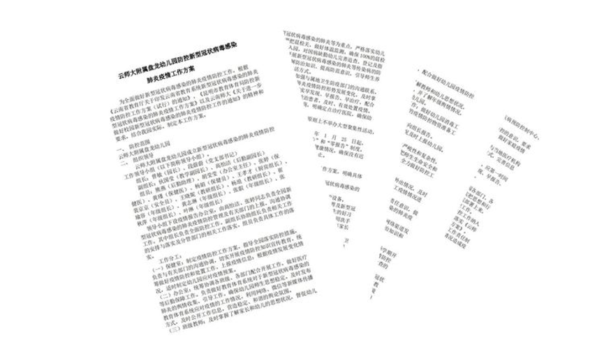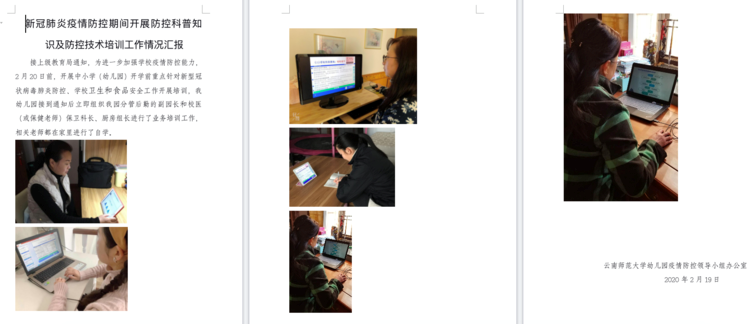 一是迅速展开联防联控工作。严格执行疫情报告制度,全面做好幼儿园疫情防控,不迟报、谎报、瞒报、漏报,做到疫情日上报、零上报、家长报、教师报、幼儿园向上级报,不疏漏每一个环节:严格落实每名幼儿身体健康状况在班级群中的每日报告制度,要求每一个家长,每天都要在班级群里上报幼儿健康信息;重点关注已排查出来的近期到过武汉和湖北的师生身体健康状况,每日追踪,要求有情况及时电话上报;对全园教职工健康状况监测,每日上报体温;对教职工返昆人员隔离工作进行监测,每日上报健康情况。