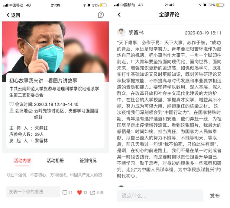 为进一步落实好学校党委关于疫情防控的各项举措和要求,同心同向、实干担当,全面参与和坚决打赢疫情防控阻击战,切实发挥党支部的战斗堡垒作用和党员的先锋模范作用,旅游与地理科学学院党委结合当前疫情防控形势和工作任务,充分利用互联网的优势,积极开展党支部线上主题党日活动,借助微信、学习强国等平台,引导师生党员深入学习贯彻习近平总书记视察国立西南联合大学旧址时的重要讲话、关于新型冠状病毒肺炎疫情防控工作的重要指示、批示精神和系列部署,鼓励师生党员勇当重担,在疫情防控中做好线下教学、科研、服务和管理工作;引导各党支部和师生党员在学习强国、云岭先锋平台开展线上主题党日和组织生活,做到“停课不停学”,进一步坚定信心,同舟共济,凝聚抗击疫情的磅礴力量。