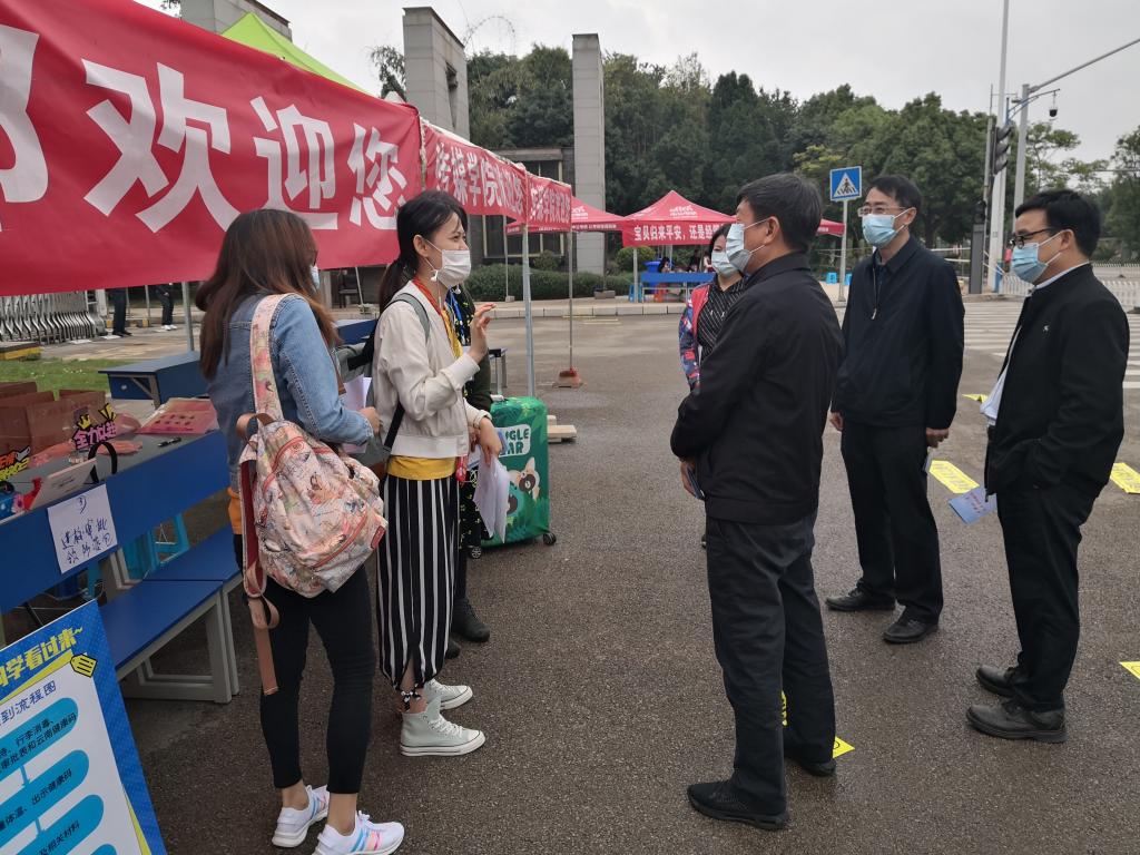 饶卫书记、蒋永文校长一行分别检查了学校呈贡校区学生返校迎接点情况,听取有关部门负责人关于疫情防控和返校复学工作开展情况汇报,详细了解返校学生人数和学生防疫物资、应急情况处置等准备情况。