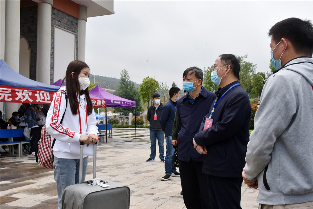 在呈贡校区3号门、4号门各学院的接待点,饶书记与刚刚返校的学生进行亲切交流,详细询问他们近期网上学习进展、返校途中安全和个人生活等情况,叮嘱学生要积极做好个人防护,安心在校完成各项学业任务,有困难及时向学校反映。饶书记一行实地查看学生公寓、食堂等重点区域,检查了解秩序管理、消毒措施、隔离区设置和防疫爱心礼包发放等情况。饶书记向参与返校接待的一线工作人员和志愿者表示慰问,叮嘱大家为返校学生提供细致周到的服务,认真做好防护工作,确保返校工作安全有序。