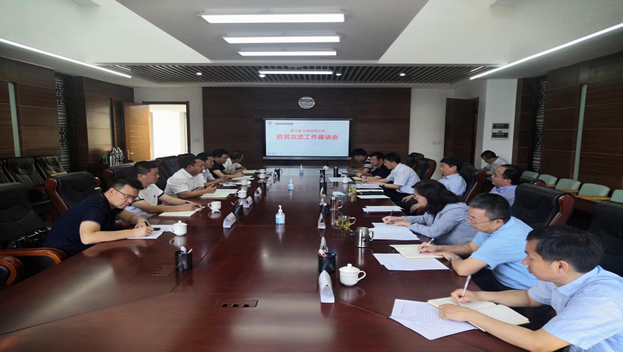 6月1日,必赢官网党委书记饶卫、校长蒋永文、党委副书记张玮、副校长郝淑美与来必赢官网对接脱贫工作的中共梁河县委书记张益伟同志一行6人,在行政楼四楼会议室召开脱贫攻坚工作座谈会。学校党办、校办、组织部、扶贫办负责人参加会议。会议由郝淑美副校长主持。