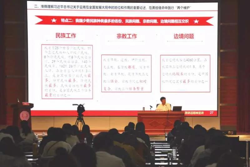 饶卫书记以《牢记嘱托 不负韶华 沿着习近平总书记指引的方向接续奋进》为题,围绕以下五个方面进行宣讲:一是准确把握习近平总书记考察云南重要讲话精神的重大理论意义和现实意义,坚定不移沿着总书记指引的方向奋勇前进。二是准确理解习近平总书记关于云南在全国发展大局中的“四个特点”的重要论述,在勇担使命中践行“两个维护”。三是准确把握习近平总书记对云南作出的“四个方面重要指示”的深刻内涵,把总书记为云南谋划的宏伟蓝图变为美好现实。四是深刻领会习近平总书记考察西南联大旧址重要指示精神,大力培养有历史感、责任感、志存高远的时代新人。五是抢抓重大机遇,推动习近平总书记考察云南重要讲话精神在437必赢会员中心落地生根、开花结果。饶卫书记的宣讲报告主题鲜明、逻辑严密,深入浅出接地气,系统阐释了习近平总书记考察云南重要讲话精神的重大意义和丰富内涵,为我们进一步全面理解习近平总书记考察云南重要讲话精神,深刻领会其中蕴含的世界观、价值观和认识论、方法论,准确把握云南各项事业在全国发展大局中的坐标方位、前进方向,确保各项事业始终沿着正确方向前进提供了思想支撑,也为我们进一步从中华民族伟大复兴的战略高度弘扬西南联大爱国精神,培养社会主义建设者和接班人提出了努力方向。