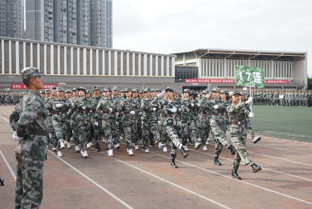 在分列式汇报中,伴随着雄壮激昂的《中国人民解放军进行曲》,各方队学生昂首阔步、英姿飒爽,迈着矫健、整齐划一的步伐划通过主席台接受检阅;学生代表和教官连队进行了军体拳表演,他们出手刚劲有力、气势如虹;教官连队进行了擒敌拳、匕首操和擒拿互搏、击膝抱摔、砸背锁喉等军事格斗演练,充分展示了中国军人坚韧刚强的意志,赢得了现场阵阵掌声。