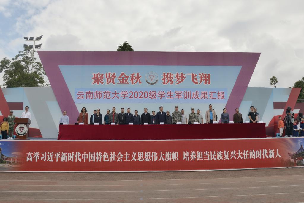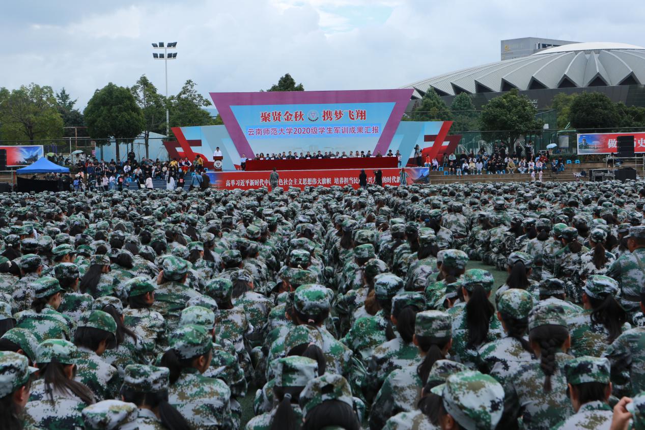 10月5日上午,437必赢会员中心2020级新生军训成果汇报在呈贡主校区西区田径场举行。中国人民解放军31632部队党委常委、纪委书记、副政治委员李艳峰上校,政治工作部副主任吴远江中校,校党委李宏副书记,牛治亮副校长出席;学校学生工作领导小组成员单位负责人,中国人民解放军31632部队全体带训教官,各学院(学部)党委副书记、辅导员、带训教师,及2020级7000余名军训学生参加了成果汇报。汇报大会由学生军训团团长、学生处处长张国华主持。
