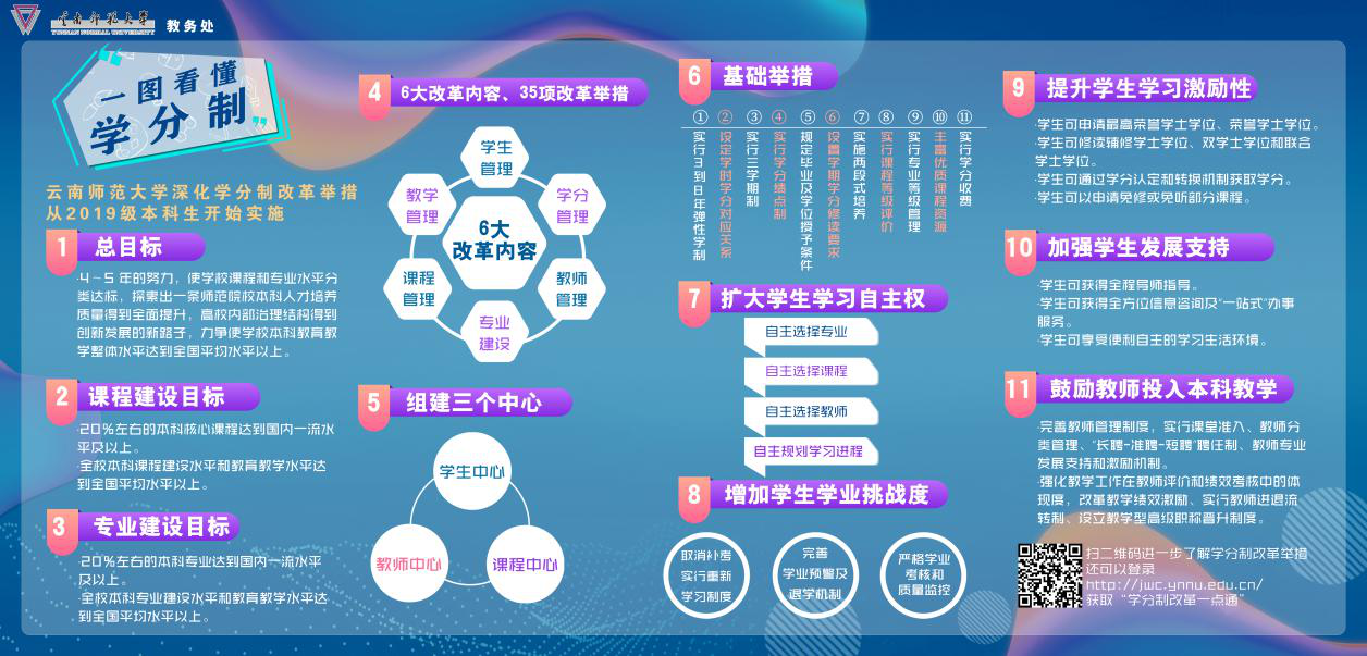 学校作为云南省学分制改革试点高校之一,2018年启动新一轮学分制改革工作,并从2019级学生开始全面实施学分制改革。面对“不改必退、慢改也退”的竞争态势,学校按照“学生中心、产出导向、持续改革”的学分制改革理念,从学分管理、教学管理、学生管理、课程管理、教师管理、专业建设六个方面实施35项改革举措,大力推进“教师中心、学生中心、课程中心”建设,实行专业等级管理和课程等级准入与评价管理,加强教师教书育人能力培养并推行优绩优酬,扩大学生选择专业、课程、教师以及安排学业进程的自主权,强化对学生的全过程学业指导,严格学生学习过程管理,以此建立基于质量评价的资源配置和教学激励机制,从根子上推动解决“教师不好好教,学生不好好学”的问题,构建起党委领导、教师投入、学生倒逼、专业奋进、课程支撑、评估促进的一流本科建设机制。