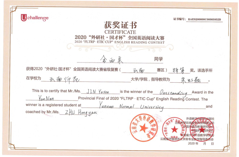在此前11月7日以线上形式进行的阅读比赛云南省赛区复赛中,必赢官网体育学院2017级本科生金雨柔同学从来自全省各大高校的选手中脱颖而出荣获特等奖,赢得了代表云南省参加全国决赛的资格;张一行同学获一等奖。在同一天进行的写作比赛云南省赛区复赛中,张一行同学获一等奖,金雨柔同学获二等奖。