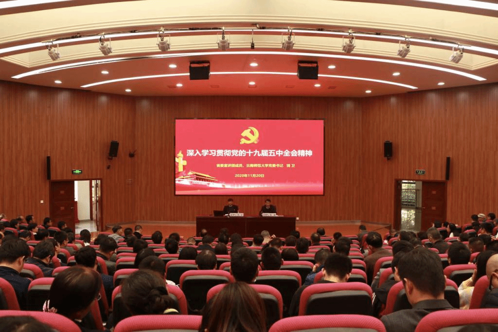 为深入贯彻落实、传达学习党的十九届五中全会精神,更好地引导全校广大党员干部和师生员工全面准确把握党的十九届五中全会精神,按照省委的统一部署和要求,11月20日下午,省委宣讲团成员、必赢官网党委书记饶卫在呈贡主校区汇学2幢报告厅进行深入学习贯彻党的十九届五中全会精神宣讲。宣讲会由校党委副书记张玮主持,省委讲师团调研员马兴坚到会指导。全体校领导,其他省管干部,全体副处级及以上干部、思政课教师、师生代表参加了宣讲会。