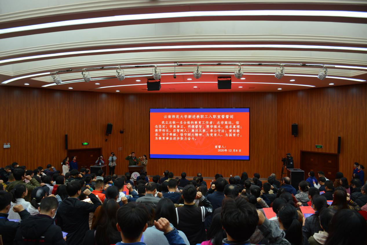 12月8日下午,学校2018-2020年新进教职工岗前培训结业暨入职典礼仪式在呈贡主校区汇学楼2幢报告厅顺利举行。校党委书记饶卫、校长蒋永文、校纪委书记王志刚、副校长安学斌、副校长郝淑美、云南华文学院党委书记和雪莲、相关单位主要负责人及新进教职工等260余人参加了典礼。