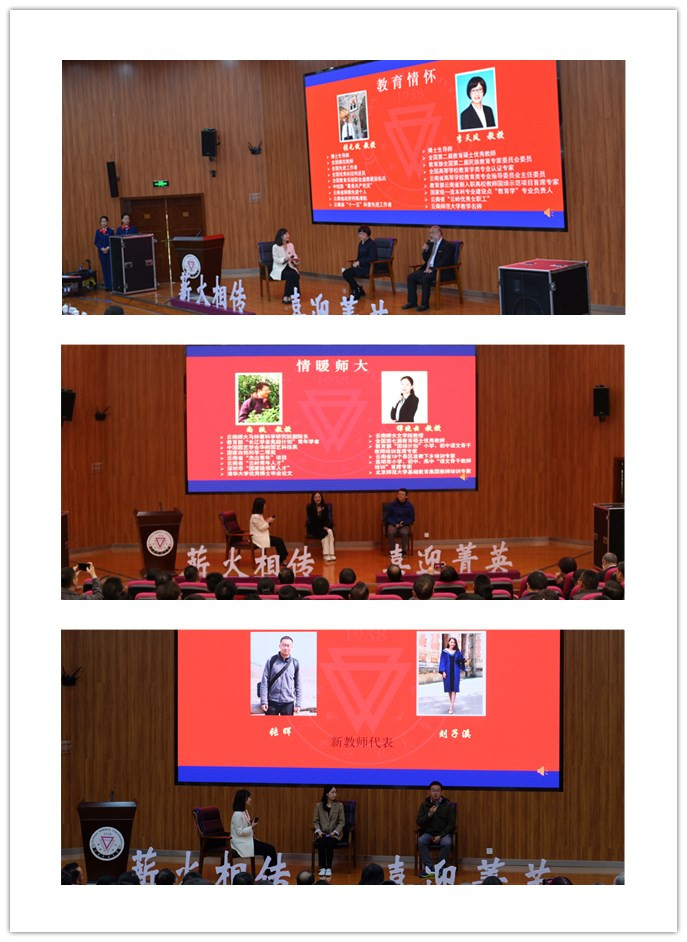 典礼以“薪火相传·喜迎菁英”为主题,在现场访谈老教师代表李天凤、张无敌两位教授中拉开了序幕。两位老教师回忆了他们与学校一起成长的漫长岁月,分享了他们在教育生涯中最感动的故事,让大家感受到了他们对教育事业的情怀。中青年优秀教师代表尚轶教授、谭晓云教授讲述了他们与师大共成长、同进步的故事,希望新进教师把个人的发展和团队的发展融合起来、把爱的力量注入到教育中去。新入职教师张晖、刘子溪代表新进教师畅谈了与师大第一次见面的感受,对未来工作提出了规划和设想。