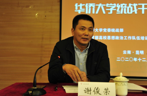 华侨大学党委统战部谢俊荣部长在致辞中首先感谢437必赢会员中心的鼎力支持和精心安排,为培训班搭建了良好的学习平台。他强调,华侨大学直属中央统战部,以“为侨服务,传播中华文化”为办学宗旨,统战特色鲜明,任务艰巨,使命光荣。他要求,要以此次培训为契机,积极参与学习和研讨,严格遵守培训纪律,进一步增强统战意识,提升统战业务能力,确保学校统战工作能够持续、更好的向前发展。