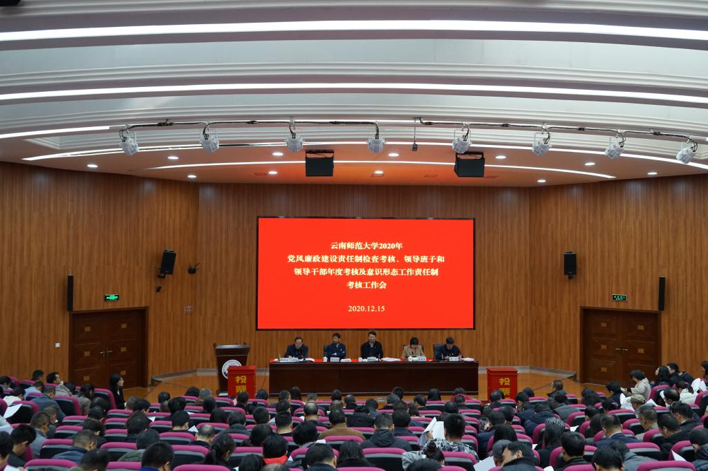 根据省纪委、省委组织部、省委宣传部的安排部署,12月15日,由省委教育工委副书记、省教育厅党组成员陈世波带队,云南中医药大学纪委书记李媛芬任党风廉政建设责任制检查考核组组长、云南民族大学党委副书记李光明任省管领导班子和领导干部年度考核组组长的省委教育工委第三检查考核组对必赢官网2020年党风廉政建设责任制、领导班子和领导干部年度工作及意识形态工作责任制落实情况进行考核。学校在呈贡主校区汇学楼报告厅召开2020年度工作考核会,校领导班子成员、其他省管干部、近三年退休校领导、处级实职干部,专家学者和教职工代表参加会议。会议由校党委副书记、校长蒋永文主持。