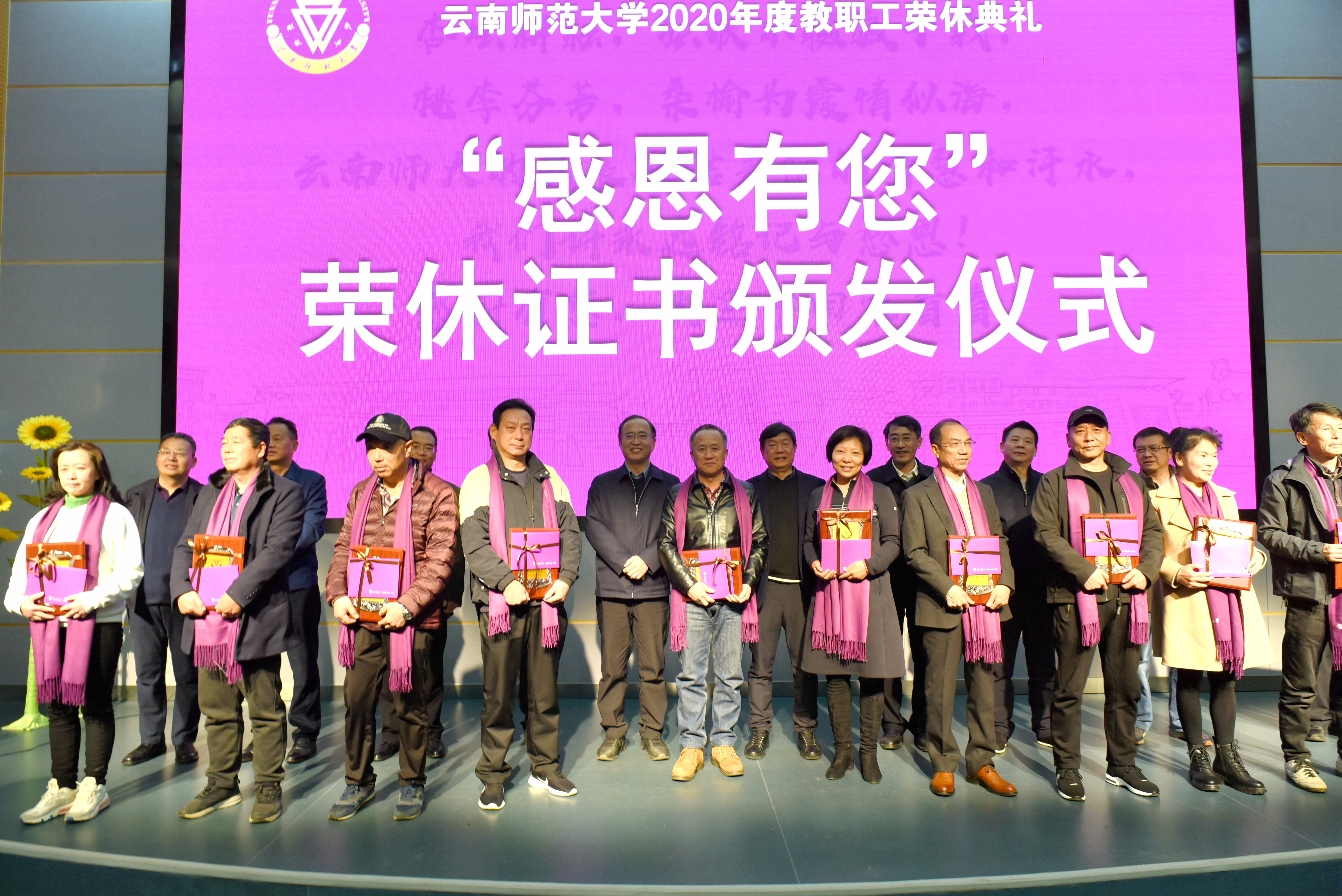 12月29日下午,必赢官网2020年度教职工荣休典礼在呈贡校区西边中心报告厅举行。学校全体党政领导,2020年度退休教职工代表,各学院(学部)、各部门、直属单位、教辅单位主要负责人参加典礼。