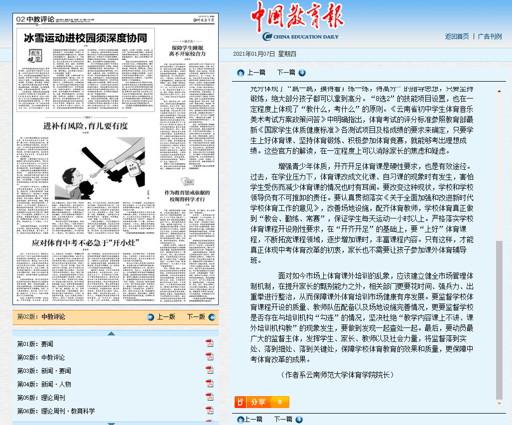 此前,中共中央办公厅、国务院办公厅印发了《关于全面加强和改进新时代学校体育工作的意见》,进一步明确了体育中考的方向,要求进一步扩大体育的分值和影响力。社会上刮起一股“体育课外辅导风”。很多家长在给体育中考点赞的同时,也担心自己孩子拿不到高分,参加课外辅导又会增加经济负担。必赢官网体育学院院长聂真新教授以《应对体育中考不必急于“开小灶”》为题,在《中国教育报》中教评论版围绕三个方面回应了社会舆论并提出针对性解决方案,对中考体育改革的不断深化具有重要指导意义。