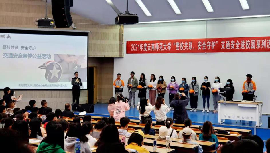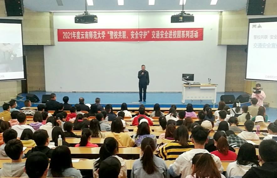 3月12日上午,“警校共联、安全守护交通安全宣传活动在呈贡校区汇文楼2区105报告厅举行,蔡金红副校长、保卫处副处长汪飞奇、昆明市公安局交通警察支队五大队四中队长皮序东、民警王磊、民警杨淑华、各学院学生代表300余人参加此次宣传活动