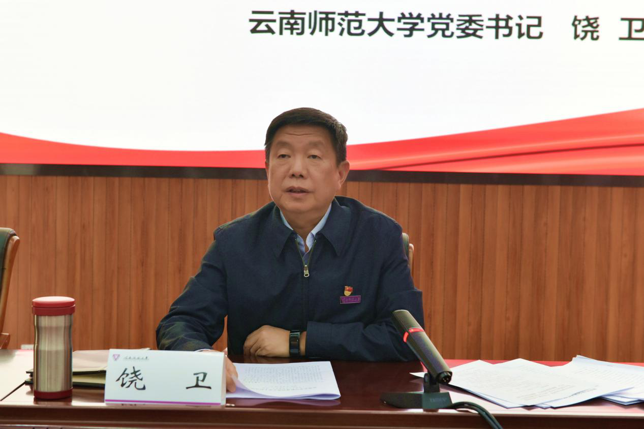 会上,校党委书记饶卫围绕以下三个方面,对全校开展党史学习教育进行了动员部署,提出了明确要求。第一,准确把握党史学习教育的目标要求:一是学史明理,感悟创新理论伟力;二是学史增信,增强“两个维护”自觉;三是学史崇德,坚守立德树人初心;四是要学史力行,开启教育发展新局。第二,准确把握党史学习教育的六个重点:一是深入学习我们党不断推进马克思主义中国化的历史;二是深入学习我们党把握历史发展规律和大势、推动党和国家事业发展的历史主动;三是深入学习我们党始终不渝为人民的初心宗旨;四是深入学习我们党在不同历史时期成功应对风险挑战的宝贵经验;五是深入学习我们党在长期奋斗中铸就的伟大精神;六是深入学习我们党旗帜鲜明讲政治、保证党的团结和集中统一的优良传统。第三,高标准高质量完成党史学习教育各项任务,要突出学党史、悟思想、办实事、开新局,要注重学校特点、教育特色,注重以上率下、上下结合,注重融入日常、抓在经常:一是要坚持正确导向;二是要加强组织领导;三是要把握进度安排;四是要紧密联系实际;五是要创新方式方法;六是要加强督促指导;七是要做好宣传报道。饶书记强调,开展党史学习教育正当其时,意义重大。全体党员、干部要更加紧密地团结在以习近平同志为核心的党中央周围,按照党中央和省委、教育部、省委教育工委的部署安排,把党史学习教育与推进云南教育现代化、办好人民满意的教育结合起来,以实际行动增强“四个意识”、坚定“四个自信”、做到“两个维护”,扎扎实实开展好党史学习教育,确保学校“十四五”开好局、起好步,以优异成绩迎接建党100周年。
