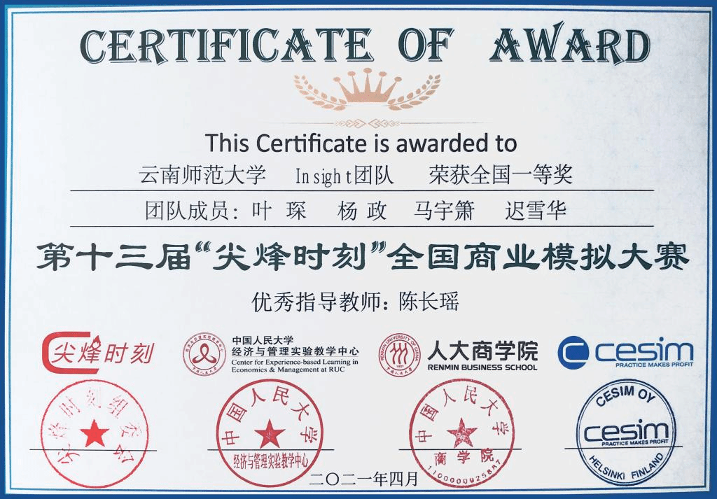 4月8日至4月11日,由芬兰“尖烽时刻”中国区组委会主办,中国人民大学承办的第十三届“尖烽时刻”全国商业模拟大赛总决赛在北京通过线上的方式举行。泛亚商学院2020级MPAcc(会计硕士专业学位研究生)叶琛、杨政、马宇箫、迟雪华组成的“Insight”代表队与北京师范大学、厦门大学、南开大学等知名高校团队同台竞技,经过4天激烈角逐,最终获得全国一等奖、英文展示奖(尖烽巧克力奖)。