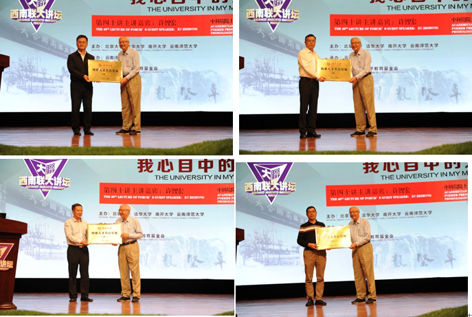 讲座结束后,许智宏院士为云南师大附属中学、曲靖一中、玉溪一中及临沧一中进行了北京大学首批博雅人才培训基地授牌。