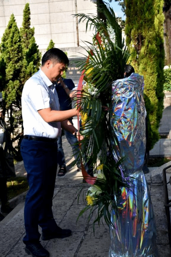 活动中,共青团云南省委代表云岭青年为一二一烈士墓敬献花篮,共青团云南省委书记唐源同志整理花篮缎带。