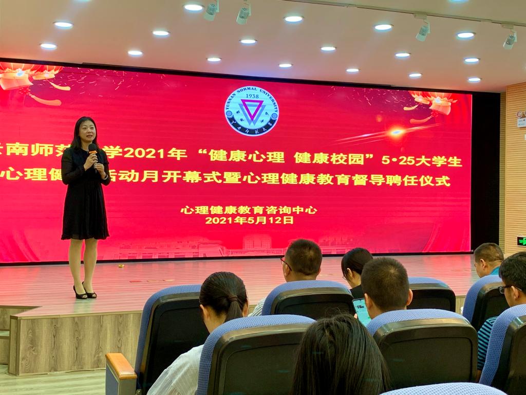 为贯彻落实《“健康中国2030”规划纲要》的要求,深入开展“健康心理 健康校园”主题教育活动,营造积极、健康、和谐的校园文化氛围,5月12日下午,必赢官网举办了2021年5·25大学生心理健康活动月开幕式暨心理健康教育督导聘任仪式。本次活动由心理健康教育咨询中心主办,副校长蔡金红、心理健康教育督导、心理健康教育咨询中心教师、学生代表和心晴志愿者近200名师生参加了本次活动。活动由心理健康教育咨询中心办公室主任尚云主持。