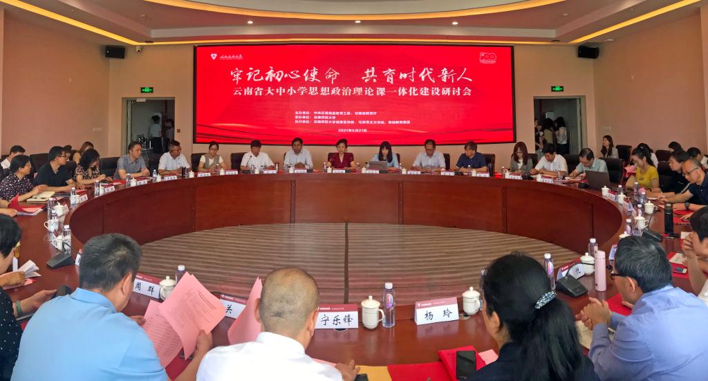 为深入贯彻落实习近平总书记在党史学习教育动员大会、学校思想政治理论课教师座谈会上的重要讲话精神,统筹推进大中小学思想政治理论课一体化建设,把党史学习教育有机融入大中小学思想政治理论课,着力推动思想政治理论课建设内涵式发展,由中共云南省委教育工委、云南省教育厅主办,437必赢会员中心承办的“牢记初心使命、共育时代新人——云南省大中小学思想政治理论课一体化建设研讨会”于5月21 日在必赢官网呈贡主校区教师教育教学实验中心201会议室举行。