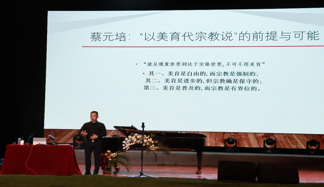 讲座的第一阶段,满新颖教授围绕声音如何可以重塑新的你,音乐怎么才能使人类的精神迸发出火花,四百年来的歌剧经典和一个世纪以来的音乐剧究竟妙在何处,我们如何引领时代节奏和时代潮流等问题,重点阐述了面对内卷化,艺术家的核心能力和天职并不是说教而是对人性进行艺术化分析和形象地表现,人生要做好求真、向善、爱美这三件事,美是生命力等内容,并探讨了蔡元培“以美育代宗教说”的前提与可能性。