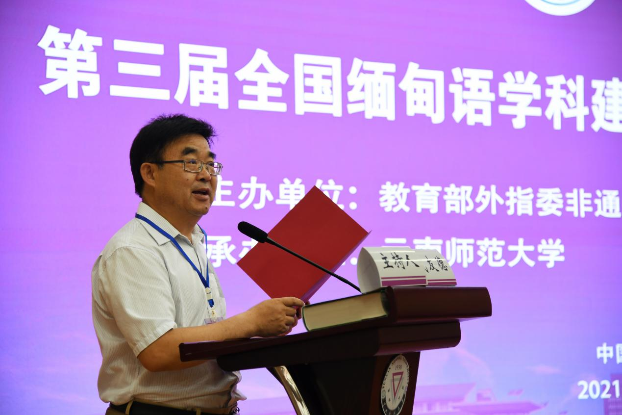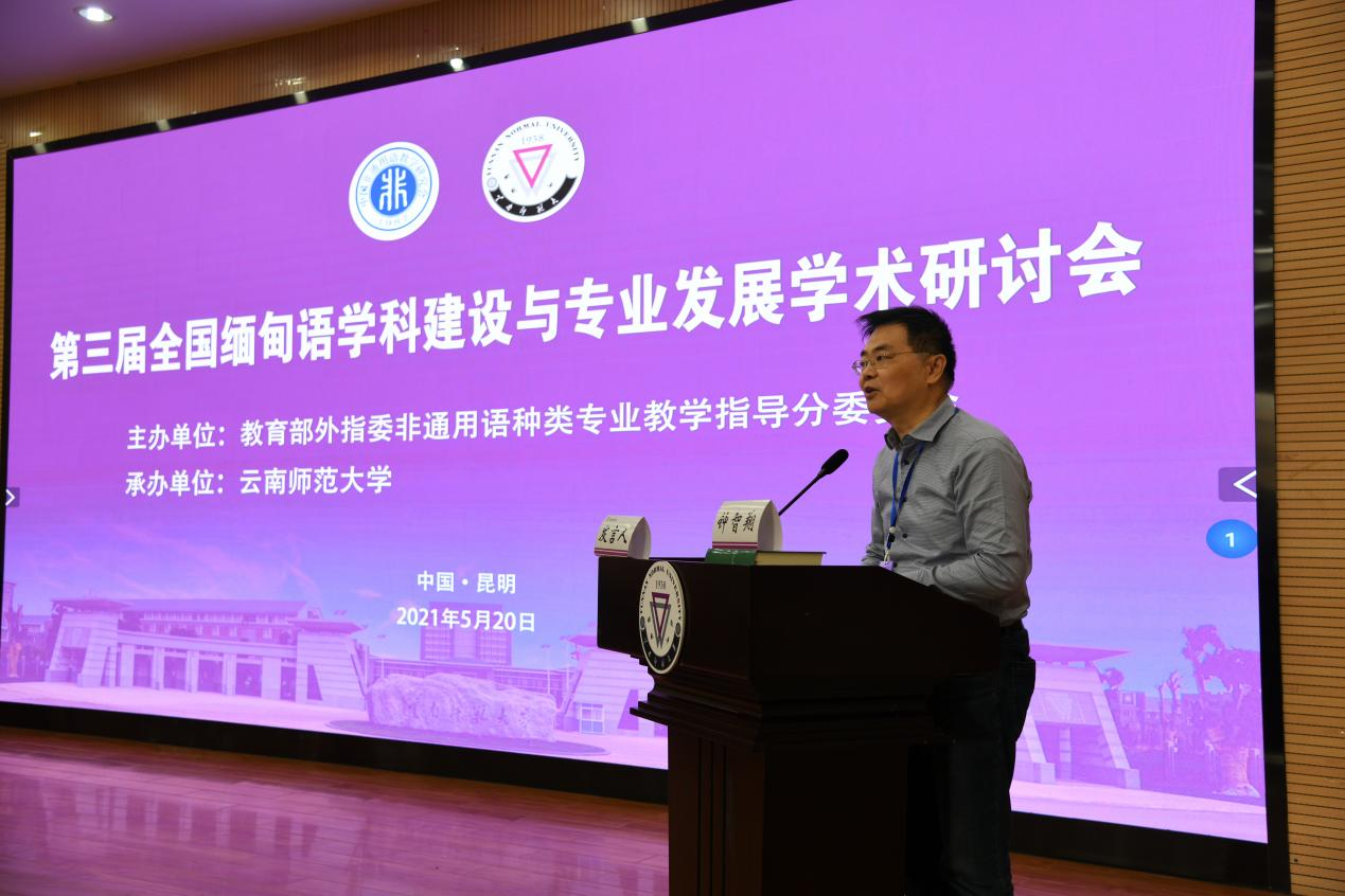 国务院学位委员会外语学科评议组成员、教育部外指委非通用语分委会副主任委员、中国非通用语教学研究会会长钟智翔教授代表主办方致辞并作了专题报告。钟智翔教授指出,缅语界不仅要培养纯语言人才,更要培养具备跨文化交际能力和出众外语水平的高层次复合型人才。同时,中国非通用语教学研究会也将协调全国缅语教学与科研资源,更好地服务于“新文科”建设和国家“一带一路”倡议。
