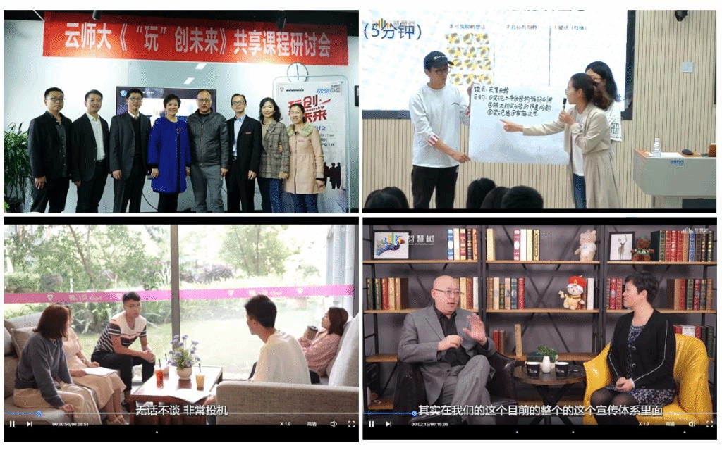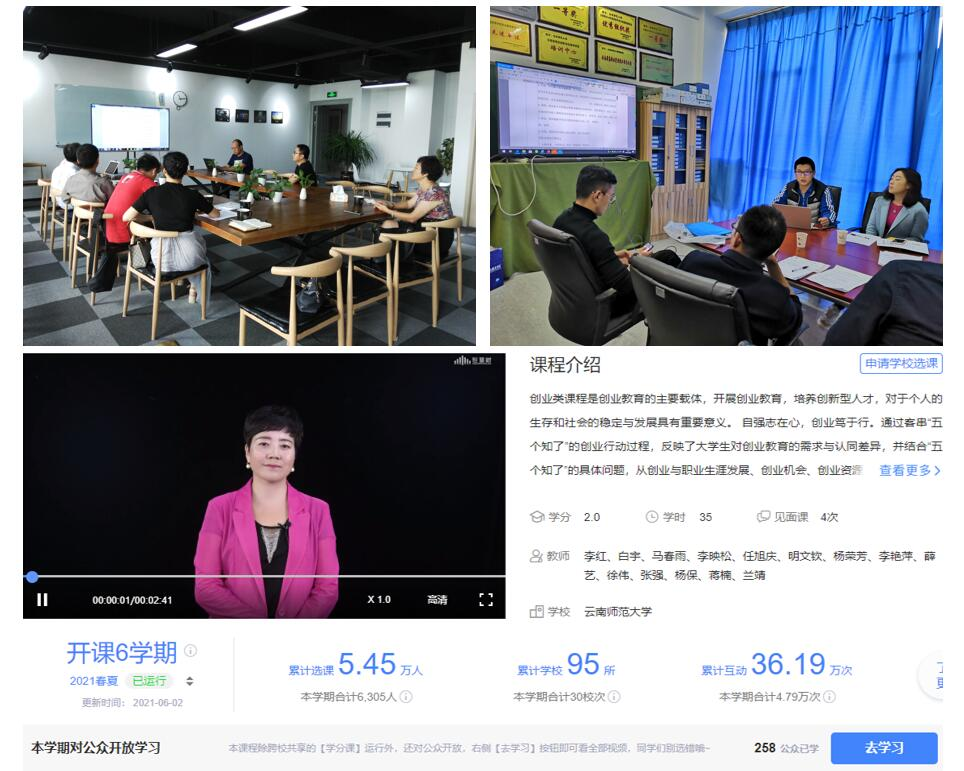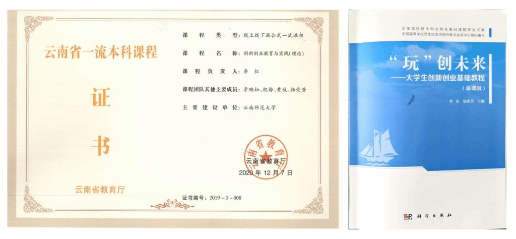 《“玩”创未来》于2018年被全国高等学校信息咨询与就业指导中心立项建设,至今已面向全国开课5学期,累计选课5.45万人,累计95所高校选课,累计互动36.19万次,开展直播见面课教学18次。多年来,在课程团队的努力下,课程已被认定为校级精品在线开放课程和云南省高校就业创业金课,自编的教材《“玩”创未来——大学生创新创业基础教程》于2020年由科学出版社出版。