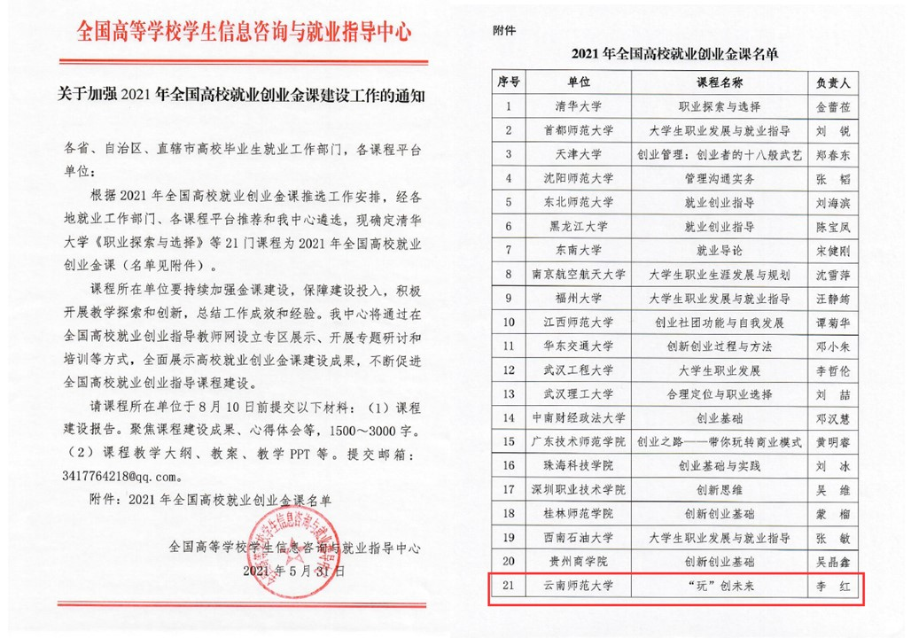 日前,全国高等学校信息咨询与就业指导中心公布了2021年全国高校就业创业金课建设名单,必赢官网就业处处长、创新创业学院办公室主任李红教授负责的线上课程《“玩”创未来》获评全国高校就业创业金课。