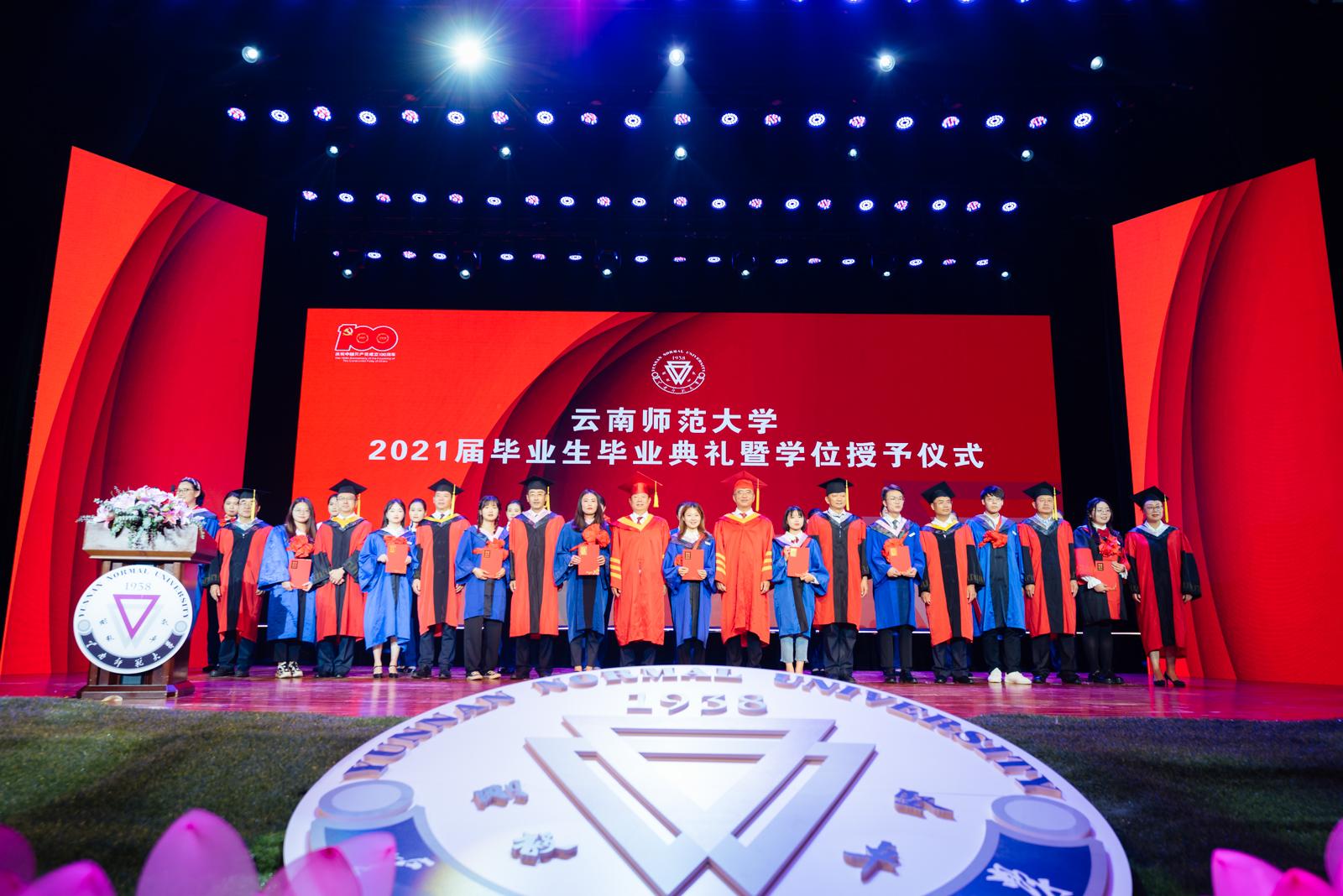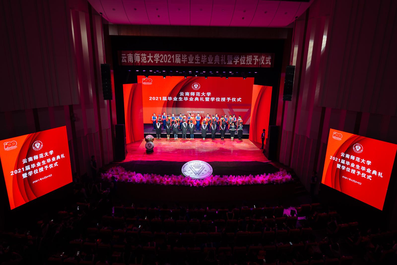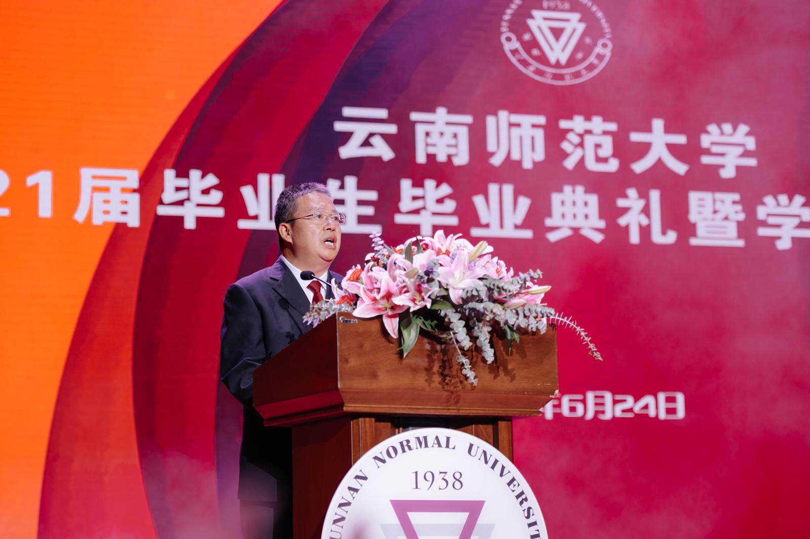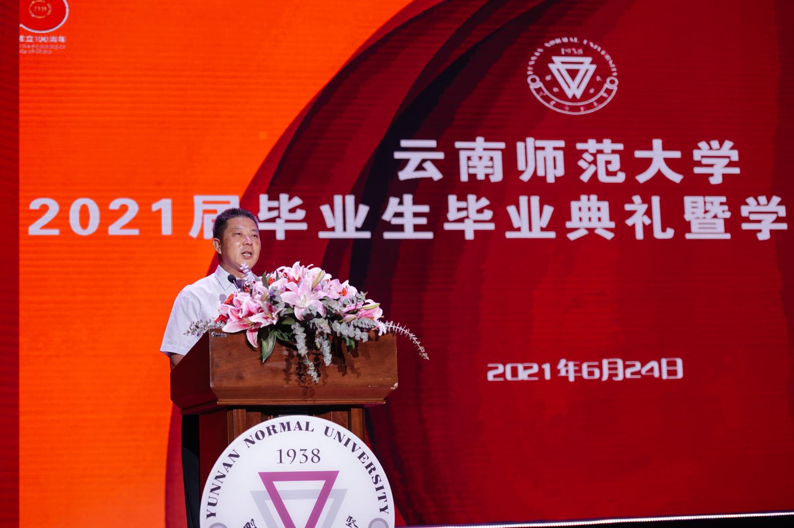 6月24日下午,437必赢会员中心2021届毕业生毕业典礼暨学位授予仪式在呈贡主校区明德5号楼演播厅举行。校党委书记饶卫,校长蒋永文,校党委副书记张玮、李宏,副校长刘宗立,校纪委书记王志刚,副校长牛治亮、安学斌、武友德、蔡金红、郝淑美,校学生工作领导小组成员单位负责人,各学院(学部)教师代表、毕业生代表共600余人参加毕业典礼。毕业典礼采取线上线下相结合的形式,超过10余万人次点击观看了现场同步直播。