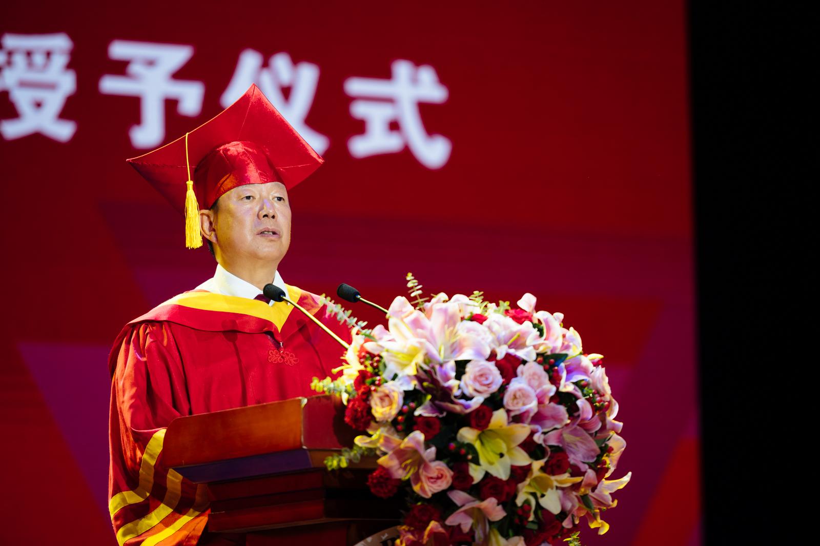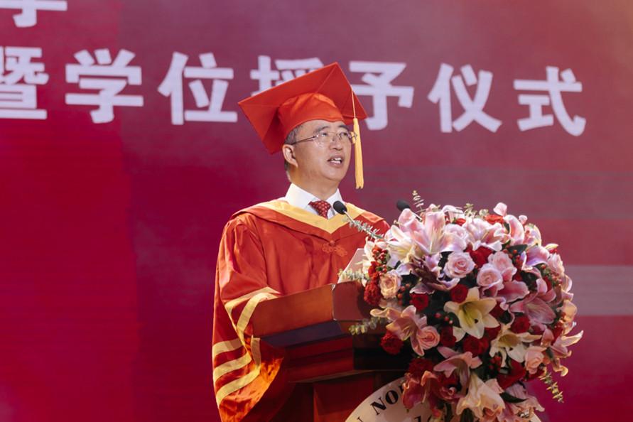 校学位评定委员会主席、校长蒋永文代表437必赢会员中心全体教职员工,向今年毕业的7420名本科生、1608名硕士和博士致以热烈祝贺。蒋校长指出,同学们生活在一个伟大的时代,“两个一百年”奋斗目标历史交汇,中华民族伟大复兴战略全局和世界百年未有之大变局深度交融。在国家乘势而上开启全面建设社会主义现代化国家新征程,向第二个百年奋斗目标进军的伟大历史阶段,同学们的时代令人羡慕,既充满无限机遇,也肩负着书写时代历史的重担,更存在前所未有的挑战。为此,蒋校长对全体毕业生提出三点殷切期望:一是希望全体毕业生不忘初心,志存高远。永葆修身报国、胸怀天下的崇高追求,把个人发展、人生价值与时代需要、国家民族发展需要紧密结合,在实现中华民族伟大复兴的新征程上建功立业。二是希望全体毕业生脚踏实地,砥砺前行。梦想是天上的星辰,永恒地照亮我们的人生;现实是脚下的土地,真实地记录着我们的足迹。作为时代新人,要走出“舒适圈”、勇闯“无人区”,主动拒绝“躺平”,积极应对“内卷”,用一点一滴的积累和锲而不舍的努力,面对人生路上的挫折与考验,迈向美好的未来。三是希望全体毕业生勇于创新,引领时代。坚持培养创新性心态、开拓创新性视野、提升创新性能力,始终以创新的思维对待学习、工作甚至生活的方方面面,在创新中激发灵感,在创新中实现价值,在创新中引领时代。