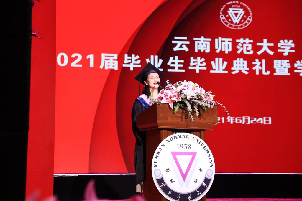 文学院汉语沐羽珊同学作为本科毕业生代表发言,分享了她在云师大四年成长蜕变的时光。在一次次接触教师这个行业中,她树立了对教育的信念。教师是一份伟大的职业,不管在任何领域,都需要脚踏实地、敢为人先的品质。在这个充满机遇与挑战的时代,她将继续坚守内心的宁静,坚持自己的热爱,乘风破浪,勇往直前。