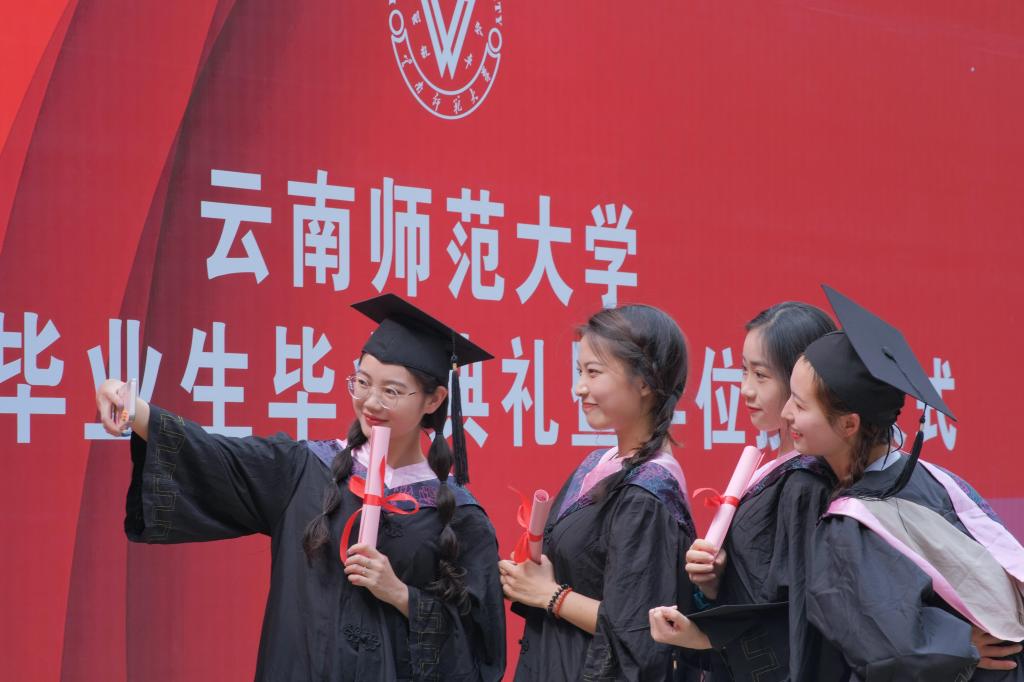 典礼前播放的暖场视频记录了我们四年在云师的点点滴滴,让我十分感动。每一个历程和记忆依旧鲜活。能够有幸在现场参加毕业典礼,我感到十分激动。回望四年大学生涯,最想说的话就是:感谢母校,感恩老师,感谢自己。