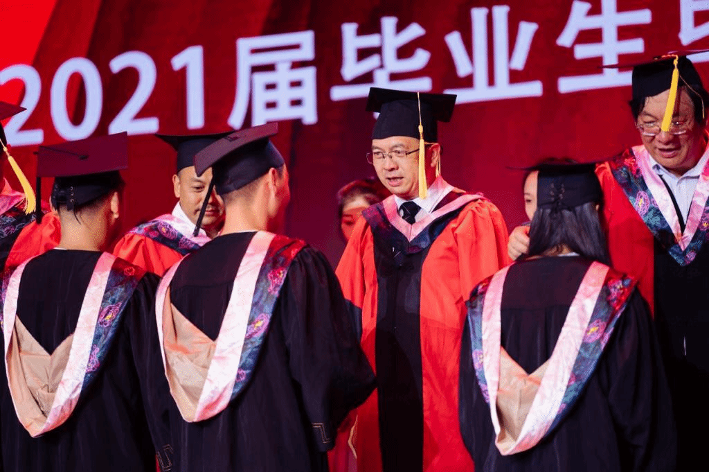 典礼最后,与会领导及学院学位评定分委员会委员为2021届毕业生行正冠礼,授予学位证书。