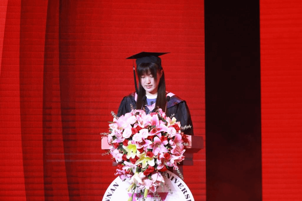毕业生代表2017级体育教育A班李婉婷同学发言,指出在云师的四年,是她拔节生长的四年,一直秉持着“刚毅坚卓”的校训,向着“更高、更快、更强”的目标前进。师大教会了她知识需扎实、作风要踏实、为人要朴实;让她成长为了今天的眼中有光芒、肩上有担当、脚下有力量的时代新青年。