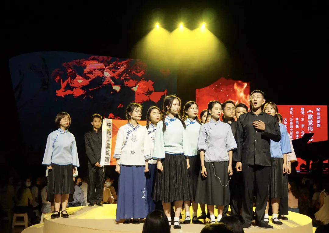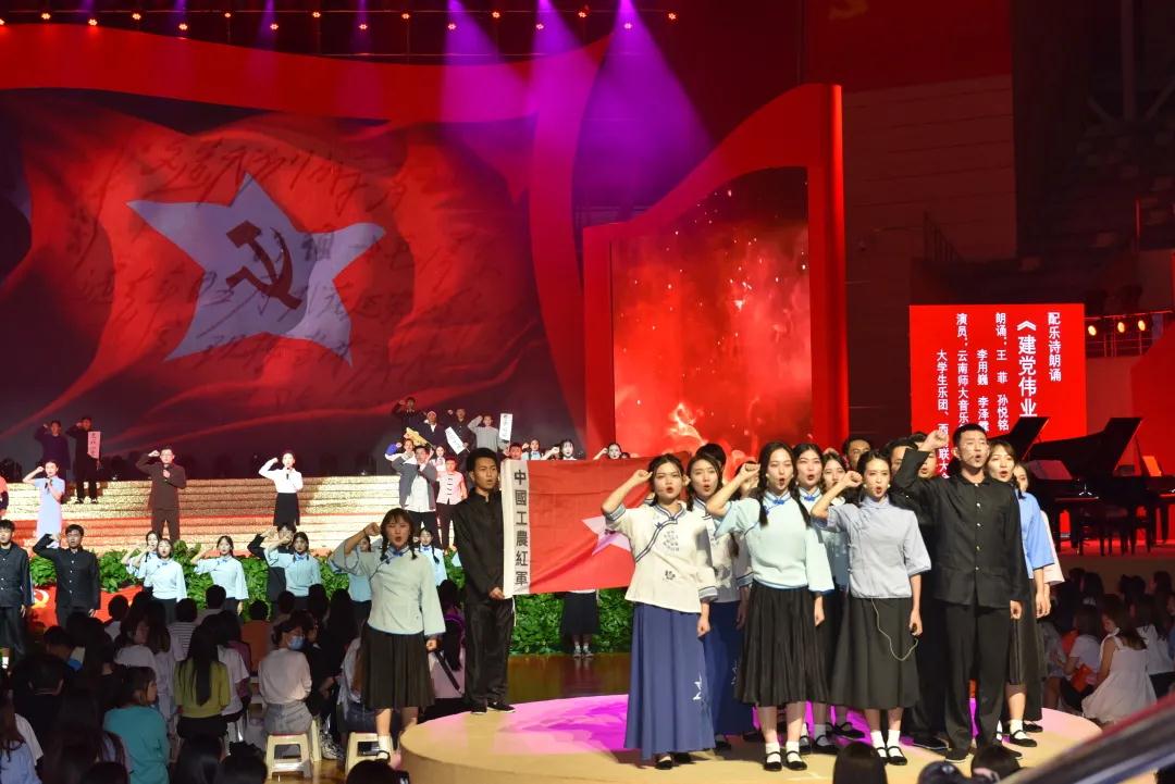 演出开始前,各学院百名青年学子纷纷接力,各方阵队先后唱响《保卫黄河》《唱支山歌给党听》《英雄赞歌》《希望的田野上》《七子之歌》《我和我的祖国》《党啊,亲爱的妈妈》等一首首红色赞歌,反映了党和国家在各个历史时期的伟大成就与精神力量,传递出莘莘云师学子爱党爱国的共同心声。