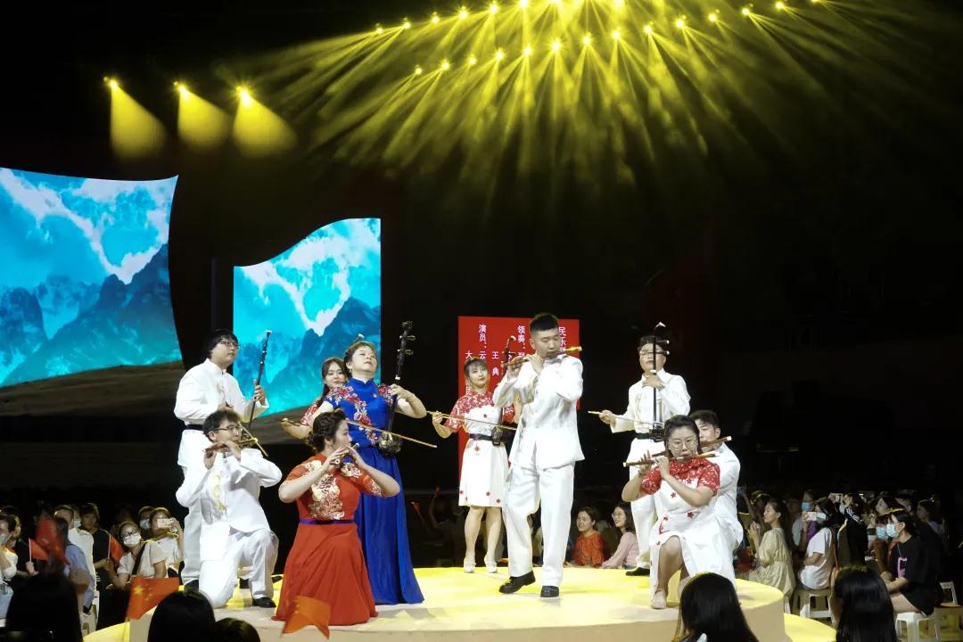 民乐联奏《云南经典回响》用葫芦丝、二胡、古筝、琵琶等中华传统乐器演奏了具有云南少数民族特色的曲目,悠扬的管弦之声演绎出在党的领导下人民翻身做主,少数民族团结富强,过上幸福美好生活的场景。