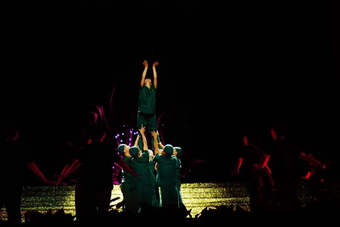 随着舞蹈者刚健的步伐,红色的绸带在台上飘扬舞动。以《东方红》为背景的群舞,生动展现了共产党人“为人民谋幸福、为民族谋复兴”的初心使命,表达了人民群众对党的真挚情感和朴素心声。